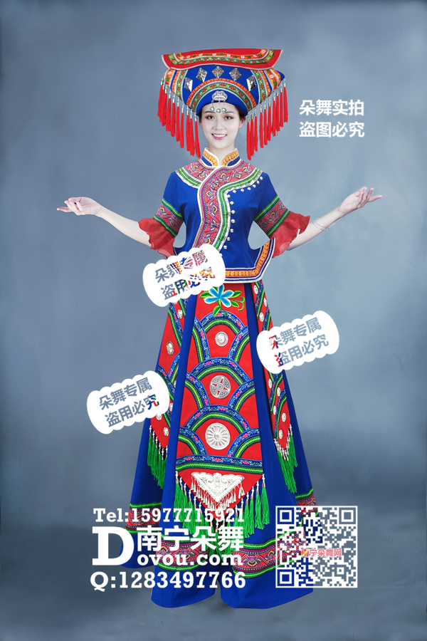 简单描述: 宝蓝翘衣角红绿腰带壮族盛装1