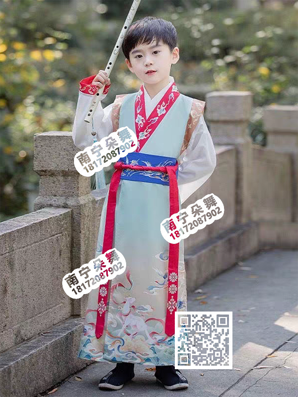 米白红领斜襟蓝腰仙纹男童汉服