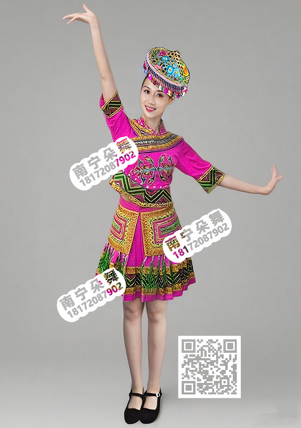 简单描述: 玫红绿边中袖花竹帽毛南族短裙