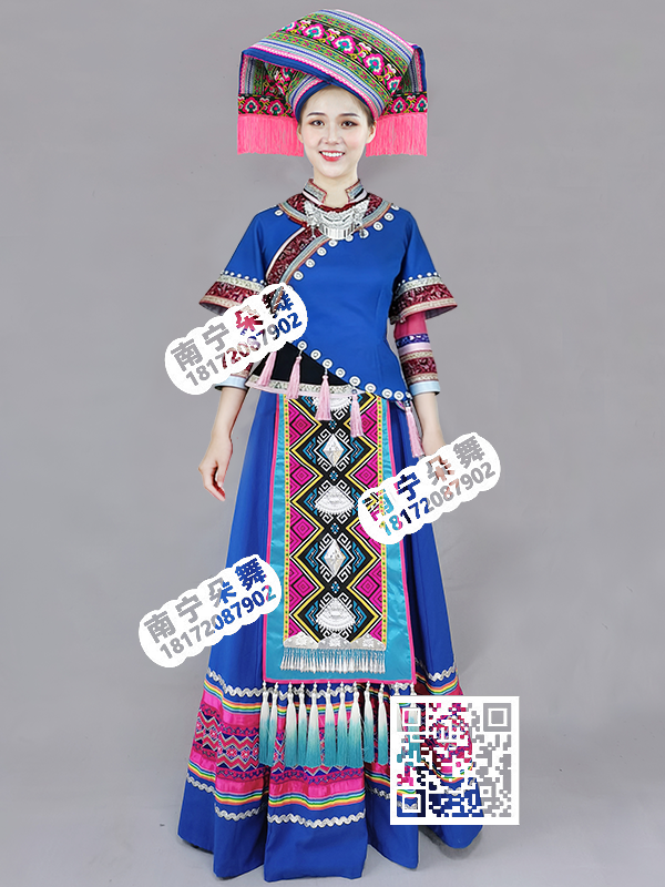 红色斜襟银饰黑边黑领仫佬族女长裙