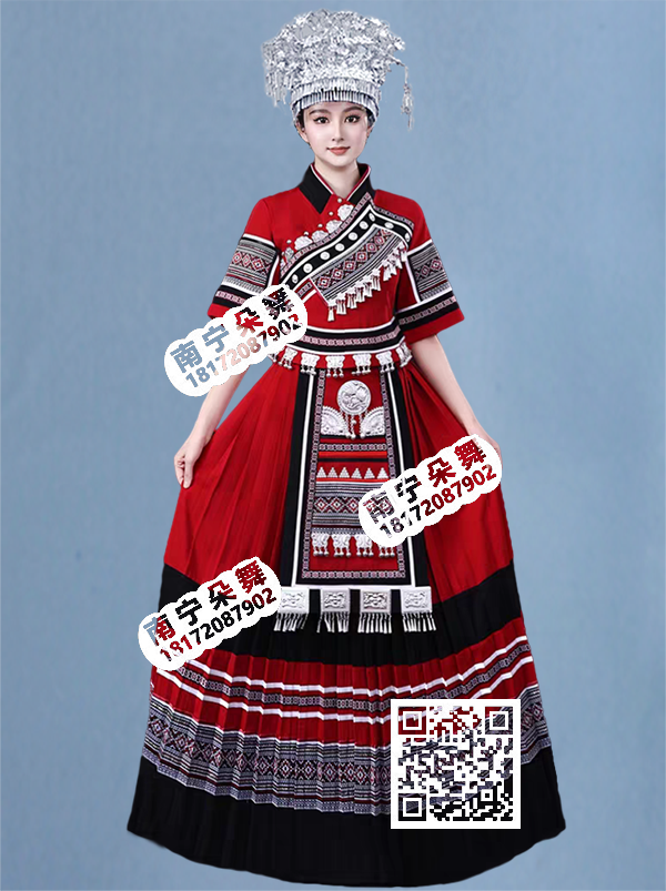 红色斜襟银饰黑边黑领苗族女长裙